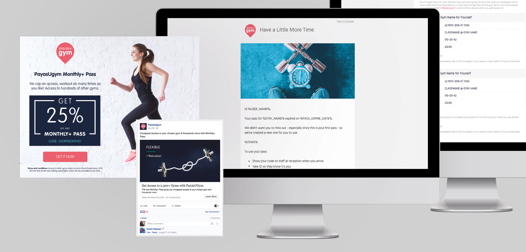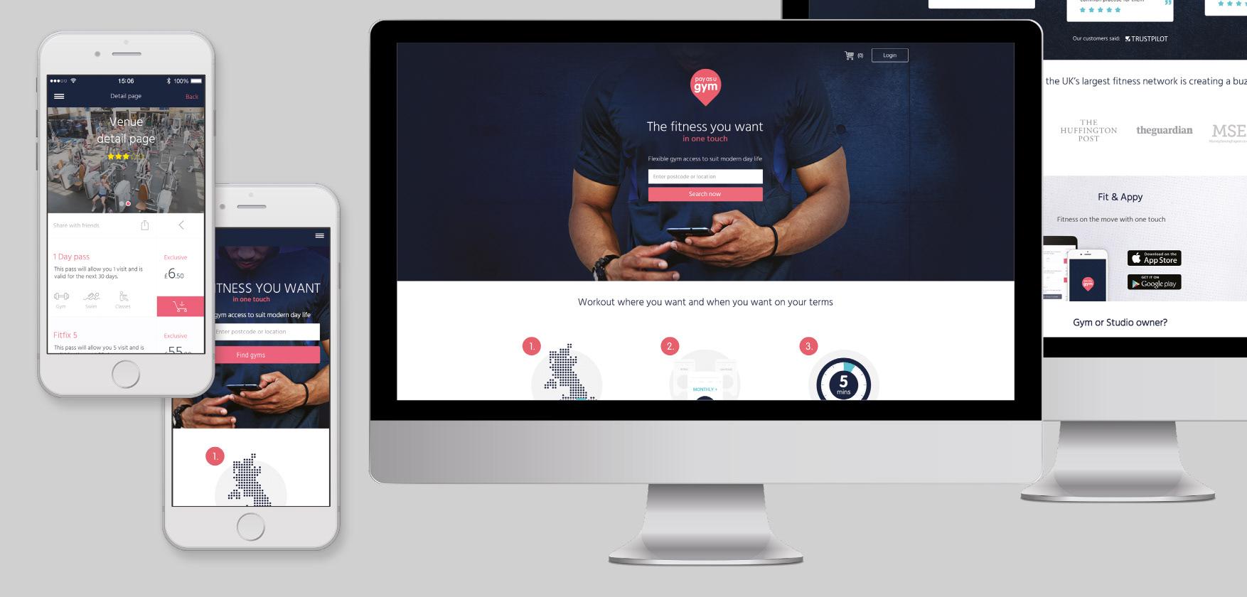 A PayAsUGym-nél inhouse designerként készítettem minden online, offline anyagot. Lehetett az a termék, pr anyag vagy hírlevél design. Minden. Még egy esemény (edzés) összes anyagát is (pólók, poszterek, goodie-bag minta, logó stb... de ezek nincsenek itt. Szóval mivel UI menüpontban vagyunk, az 1. képen szerepel a termék (weboldal) desktop és mobil verzióban, plusz pár egyéb anyag a 2. képen - az nem is való teljesen ide. Közben már átnevezték a céget és Hussle néven fut.